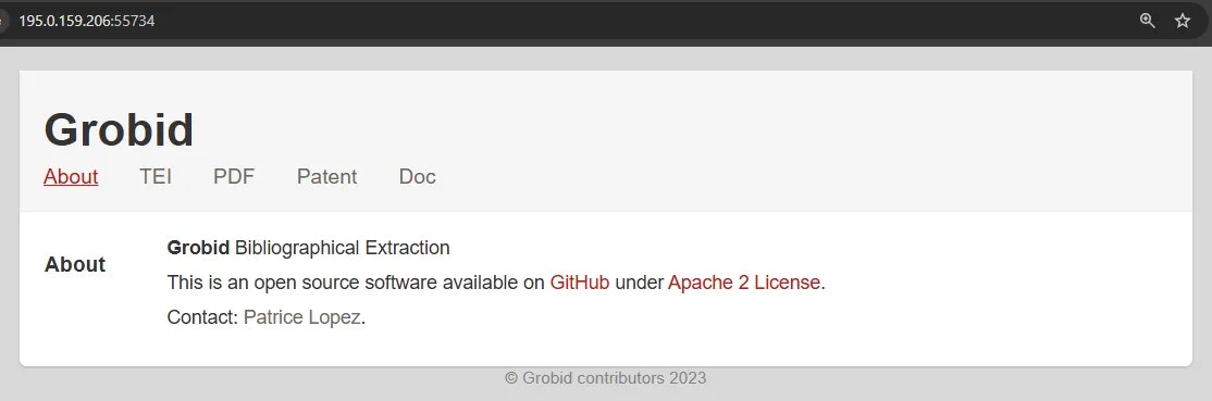 Once you have selected an instance offer, You’ll click on the INSTANCES link in the left menu and see your rented GPU instance that has your template applied. When the instance is done loading and the >_CONNECT state on the blue button appears, you should be able to see the ip range button at the top of the instance card. If you click the IP range button you will see a new modal has the IP and port information for your instance. You’ll see the port 8070 that we set listed in Open Ports. You can copy the machine IP and port and load the address (in this example: 195.0.159.206:55734) in a new browser tab or window. This address will load the GROBID web app.