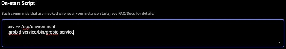 Next, we add the contents of the CMD command to the end of the bash commands section of the On-start Script fields. Also, appended environment variables to /etc/environment file in our on-start section. This makes environment variables available to all users and processes and ensures they are persistent even if our instance/docker container is rebooted. We suggest doing the same for your templates.